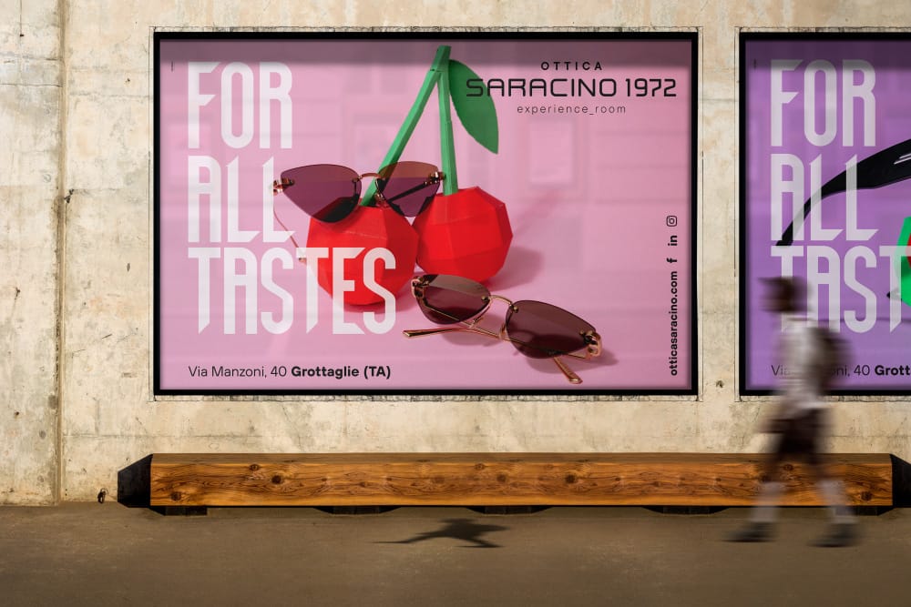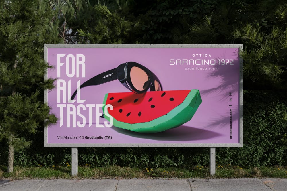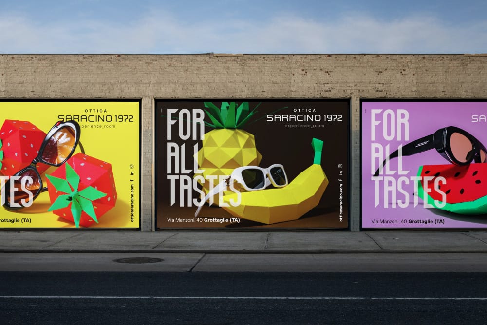 Nella campagna multisoggetto, sviluppata per affissioni e digital, abbiamo messo in mostra diversi modelli di occhiali insieme a una grande varietà di frutta per sottolineare proprio il fatto che ognuno ha i suoi gusti e da Saracino 1972 li può soddisfare.